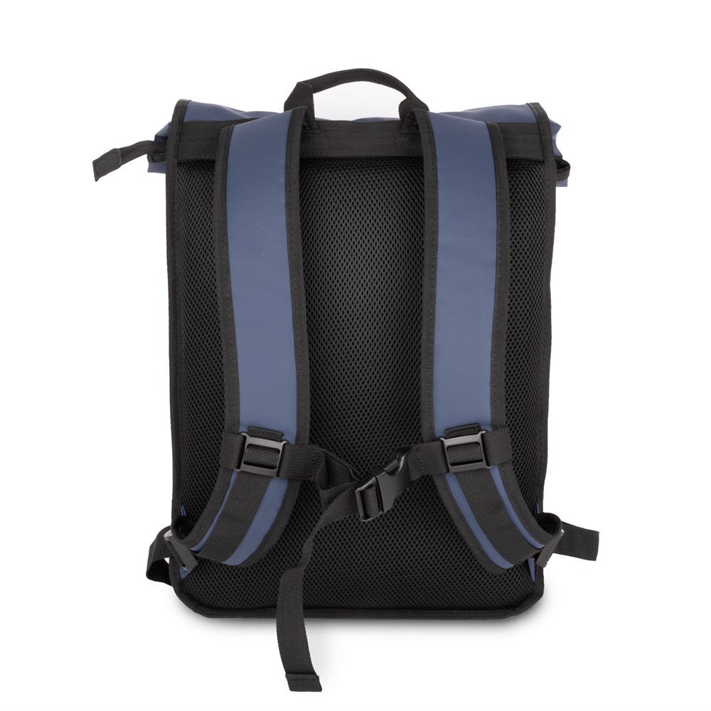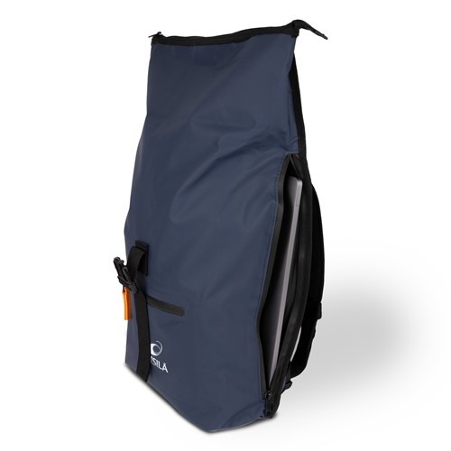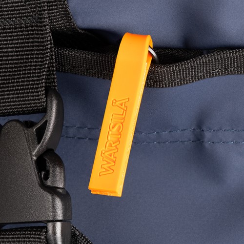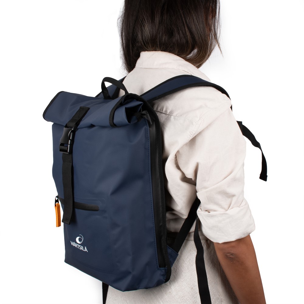 A sleek rolltop backpack with hidden side compartment for laptop. Dark blue with White Wärtsilä logo. The backpack works just as well in the city, cycling to work as your companion on outdoor activities.