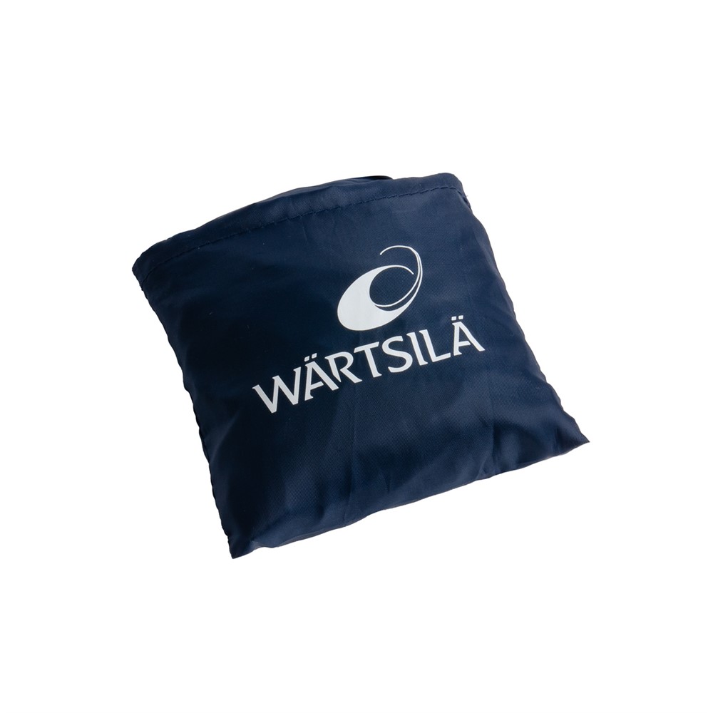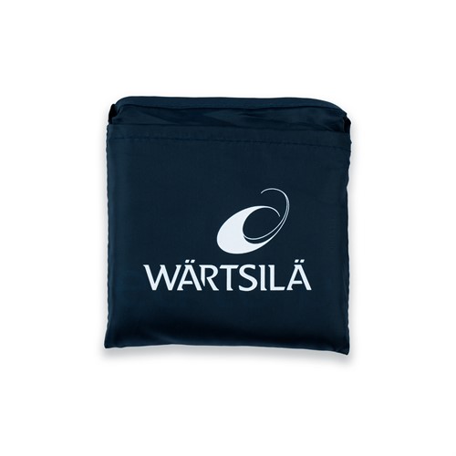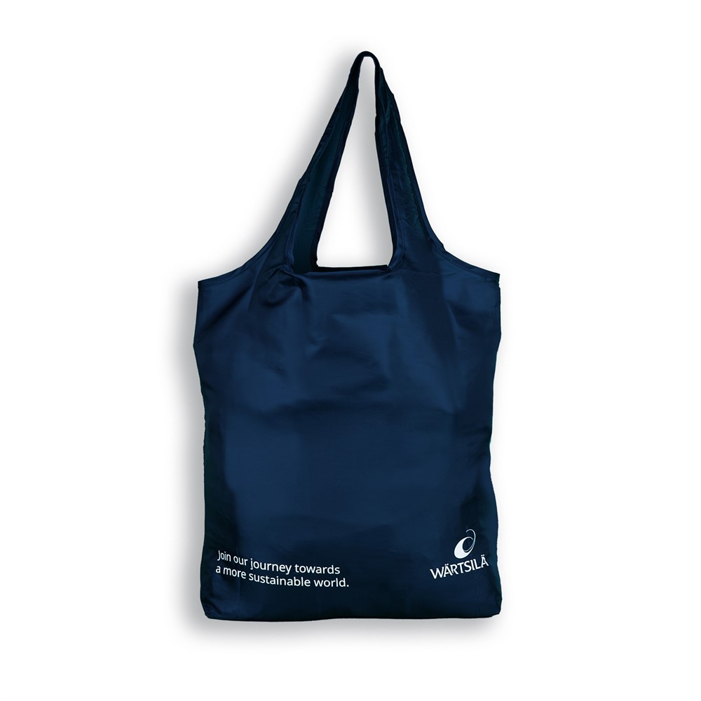 A smart lightweight, reusable bag in dark blue recycled PET. White print "This used to be a plastic bottle" on one side and "join our journey.." and Wärtsilä logo on the other side. Folds away neatly into the integrated pouch so it is easy to carry the bag in your pocket while not in use.