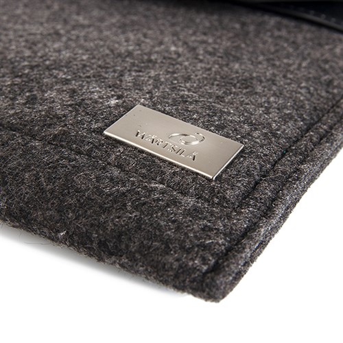 Dark grey wool felt combined with the black high quality leather makes this a luxurious choise. Metal plate with debossed Wärtsilä logo.